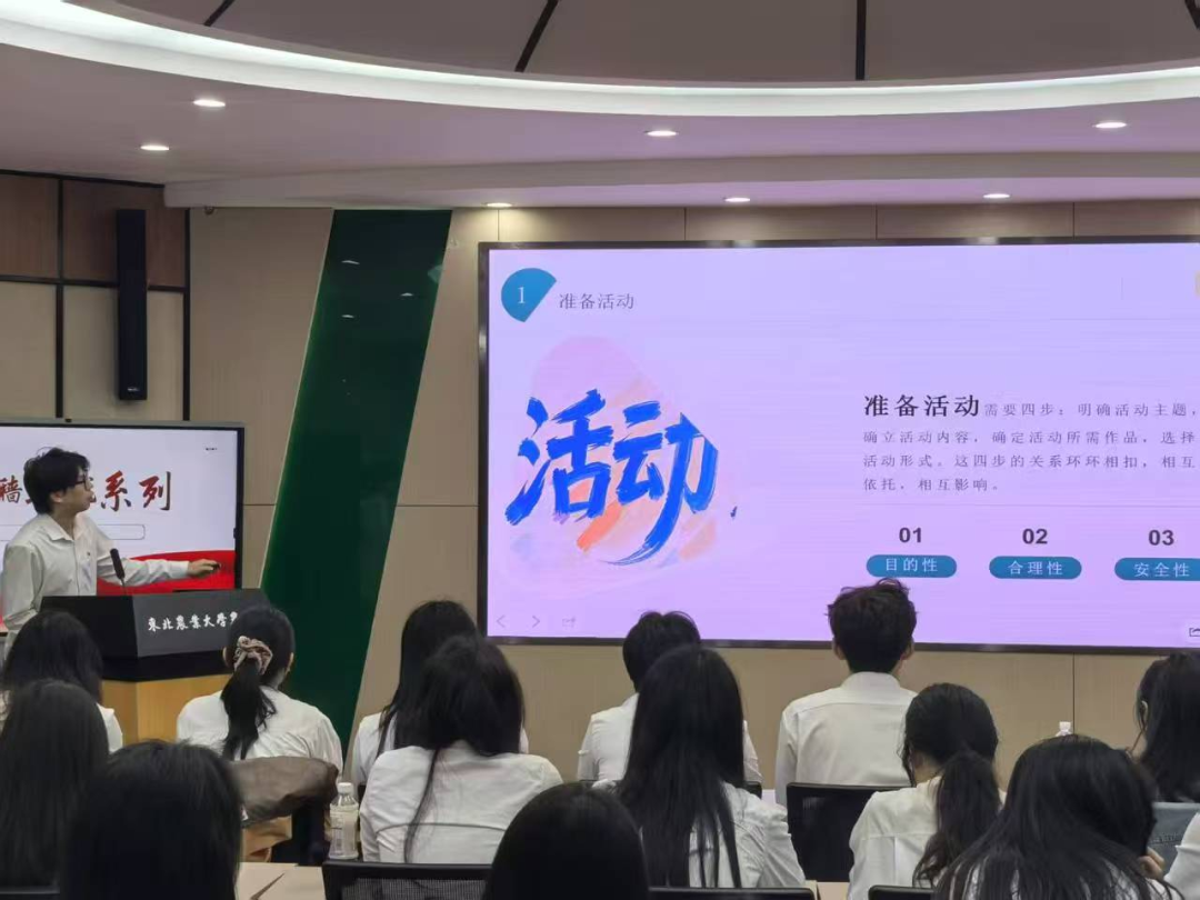 学生会综合办公室2023级部门负责人王鹏舜同学以活动策划及推进为重点,开启了会议第一项内容。以过去经手举办的活动中获得的经验以及对活动策划流程的深入理解为主体导向,抽丝剥茧般地将各个环节细致拆解,每一个步骤均一一阐述明了。通过讲解,学生干部们也对活动策划规范有了更明确、更清晰地了解。在后续工作中能够做到有章可循,为活动的顺利开展筑牢了坚实的基础。