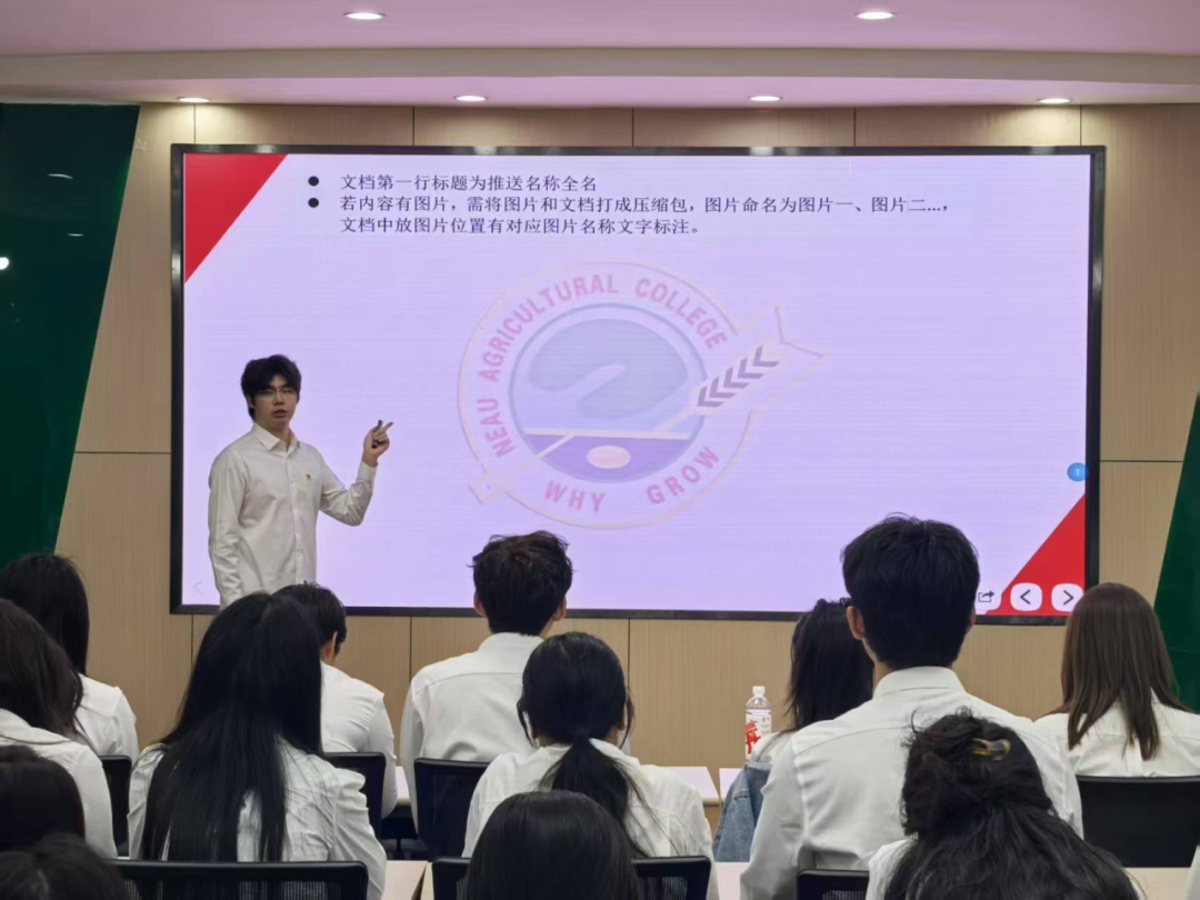 会议紧接着步入第二项内容。此次,学生会综合办公室2023级部门负责人郑绪友同学将培训重点聚焦于活动推送的撰写上。郑绪友同学结合过往的实例以及常见的问题,生动地分享了一系列实用的撰写技巧,从撰写推送的格式到推送封面的制作,无一遗漏。帮助了学生干部规避了撰写推送可能出现的错误,统一了推送撰写、学生会所需各种表格的格式,为提升活动推送质量提供有力的保障。