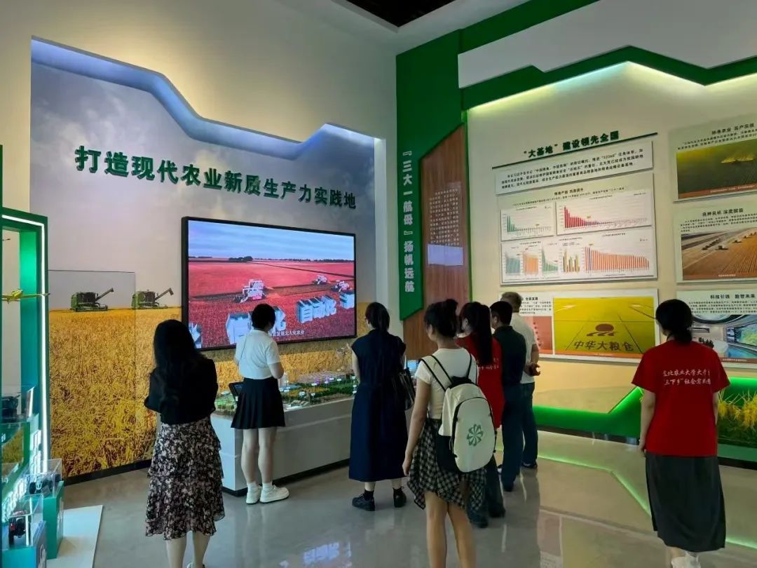 7月4日,团队成员来到黑龙江省北大荒博物馆,步入庄重典雅的展厅,仿佛穿越时空隧道,回到了那段激情燃烧的岁月。博物馆以“北大荒的开发建设史”为主线,通过珍贵文物、历史照片、文献资料的复原,全景式地再现了昔日“北大荒”的荒凉与今日“北大仓”的富饶。泛黄的老照片上,青年们肩扛锄头、脚踏冰雪,眼神中闪烁着坚毅与希望;展柜里陈列的破旧棉袄、简陋农具,无声地诉说着创业初期的艰辛与不易。当看到知青们亲手开垦的土地上长出茁壮的庄稼时,队员们深受震撼,深刻体会到“艰苦奋斗、勇于开拓、顾全大局、无私奉献”的北大荒精神不仅是历史的回响,更是激励人心的精神丰碑。