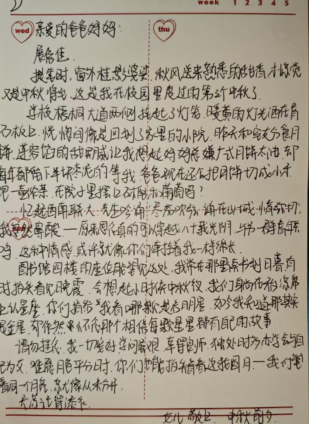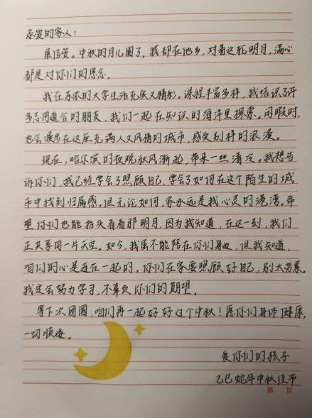 活动期间,同学们以笔为媒,将对家人的牵挂落于纸上。有的同学在信中细数校园里的成长点滴,分享专业课实验的收获与社团活动的乐趣;有的同学回忆与家人围坐赏月、分食月饼的温馨往事,字里行间满是思念;还有同学在信末绘制玉兔、月亮等中秋图案,搭配与月饼、灯笼的合影,让家书更添节日氛围。每一封手写家书都字迹工整、情感饱满,没有华丽辞藻,却用最朴素的语言诠释了“家书抵万金”的深意,展现了农科学子细腻温暖的内心世界。