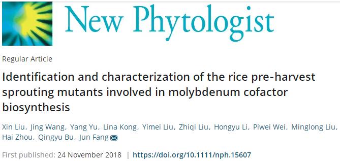 2018年11月24日,国际学术期刊New Phytologist (一区, IF=7.433)杂志在线发表了东北农业大学小麦组与中科院东北地理与农业生态研究所合作的题为“Identification and characterization of the rice pre‐harvest sprouting mutants involved in molybdenum cofactor biosynthesis”的研究论文。