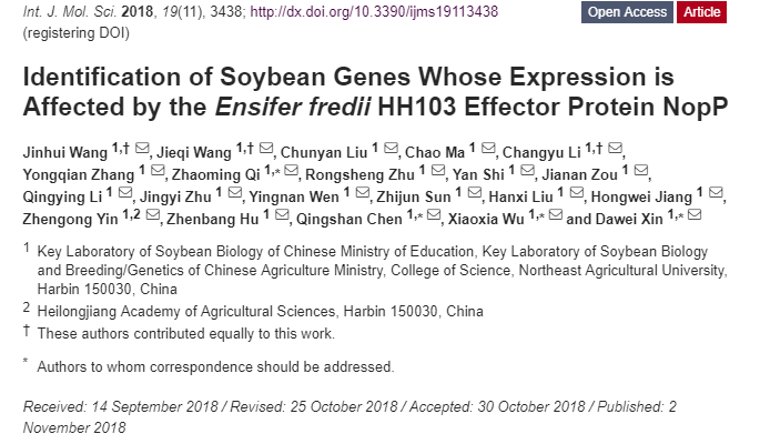 近期,国际学术期刊Plant Soil(一区,IF=3.06)和International journal of molecular sciences(二区,IF=3.66)在线发表了农学院大豆遗传改良团队的题为“Mining for genes encoding proteins associated with NopL of Sinorhizobium fredii HH103 using quantitative trait loci in soybean (Glycine max Merr.) recombinant inbred lines”和“Identification of soybean genes whose expression is affected by the Ensifer fredii HH103 effector protein NopP”的研究论文。