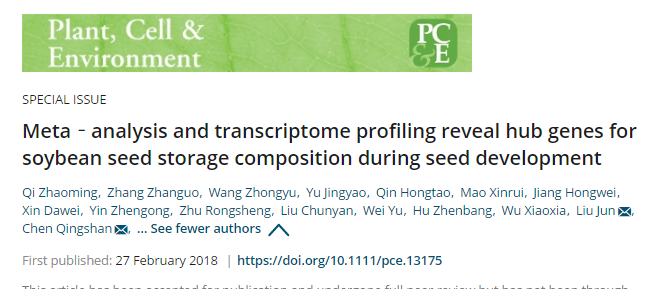 近期,国际学术期刊《Plant, Cell & Environment》,中科院1区,IF=6.173在线发表了英国威廉希尔公司官网大豆生物学重点实验室、陈庆山教授带领的大豆遗传改良团队的题为“Meta‐analysis and transcriptome profiling reveal hub genes for soybean seed storage composition during seed development”的研究论文。