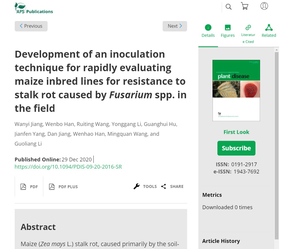 李永刚教授在植物病理学Top期刊Plant Disease上发表一种玉米自交系抗茎基腐病的快捷人工接种鉴定方法“连续注射接种法”的相关文章