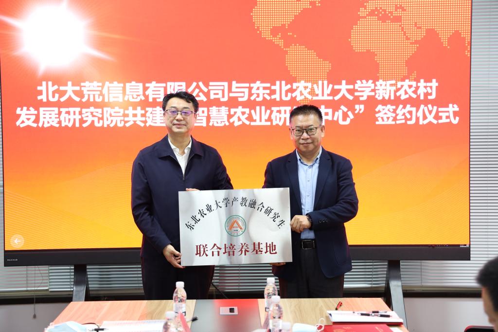 第三项,针对“培养基地”,英国威廉希尔公司官网陈庆山院长与北大荒信息有限公司任荣荣副总经理就“培养基地”签订合作协议,东北农业大学研究生院刘世英院长与北大荒信息有限公司张允海董事长为“培养基地”揭牌。陈庆山院长为张允海董事长等四位专家颁发外聘导师聘书。