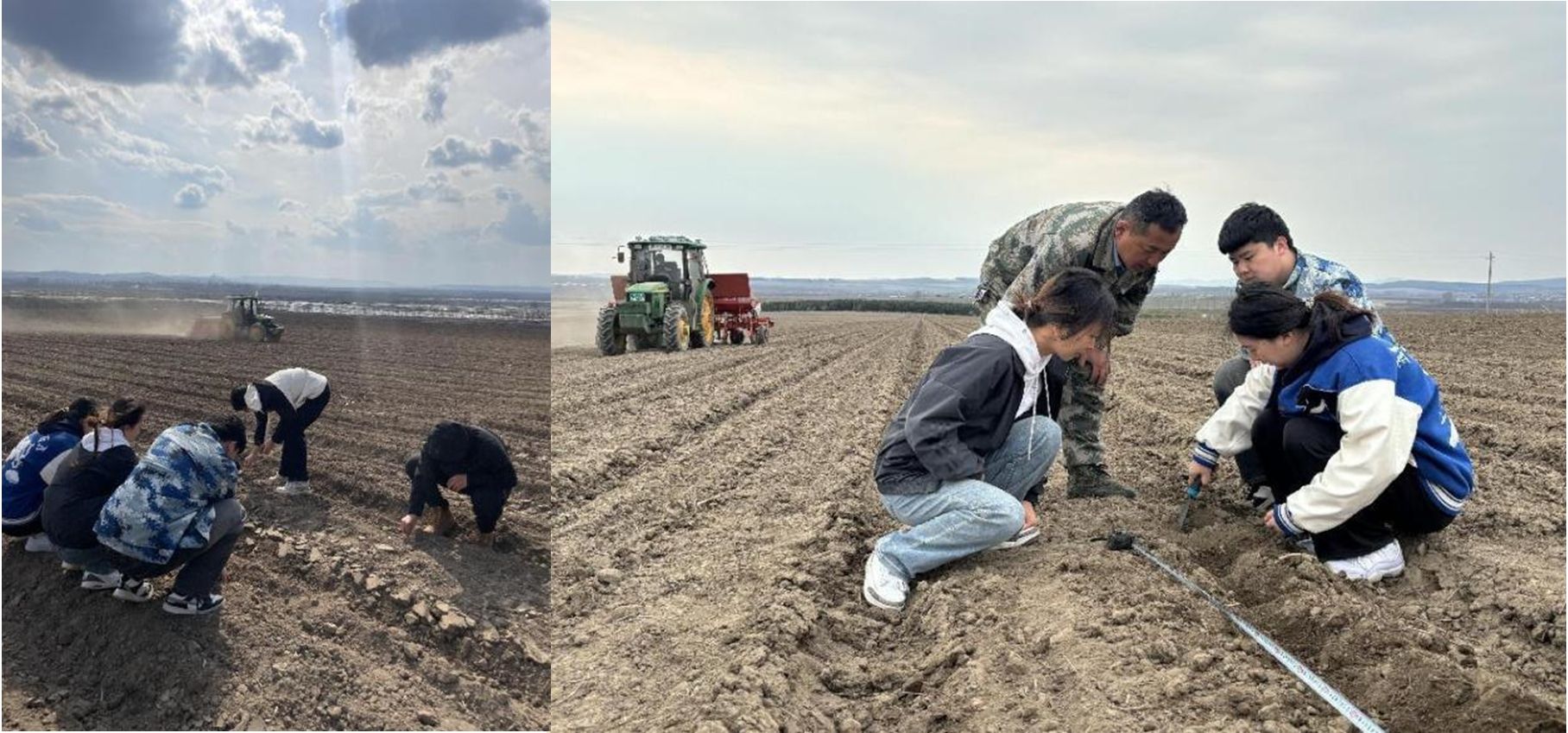 连队主任带领我们检查播种机播种后的人工检查种间距的工作,并到我们到不同地区地间实际操作,学习播种间距和播种深度,了解当地玉米栽培方式方法。此外,通过农业发展部了解当地智慧农业系统,并实践操作录入每日田间数据。
