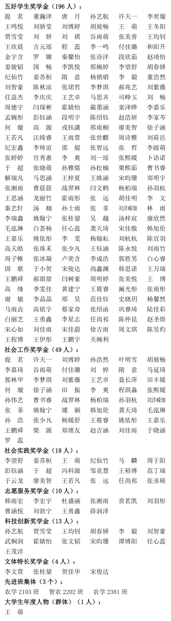 根据《东北农业大学本科生奖学金评选及管理办法》《东北农业大学本科生先进班集体评选办法》《东北农业大学大学生年度人物(群体)评选办法》《东北农业大学学生军训教官管理条例》,严格按照“公开、公平、公正”的原则,经个人申请、班级评议、学院审核和联评等环节,拟推荐提茗等196人参评五好学生奖学金,拟推荐许天一等49人参评社会工作奖学金,拟推荐李望舒等18人参评社会实践奖学金、拟推荐韩雨宏等10人参评志愿服务奖学金,拟推荐孙艺航等13人参评科技创新奖学金,拟推荐李文萱等4人参评文体特长奖学金,拟推荐农学2103班等3个本科生班级参评“先进班集体”,拟推荐王萌参评大学生年度人物(群体),现在全院范围内公示。